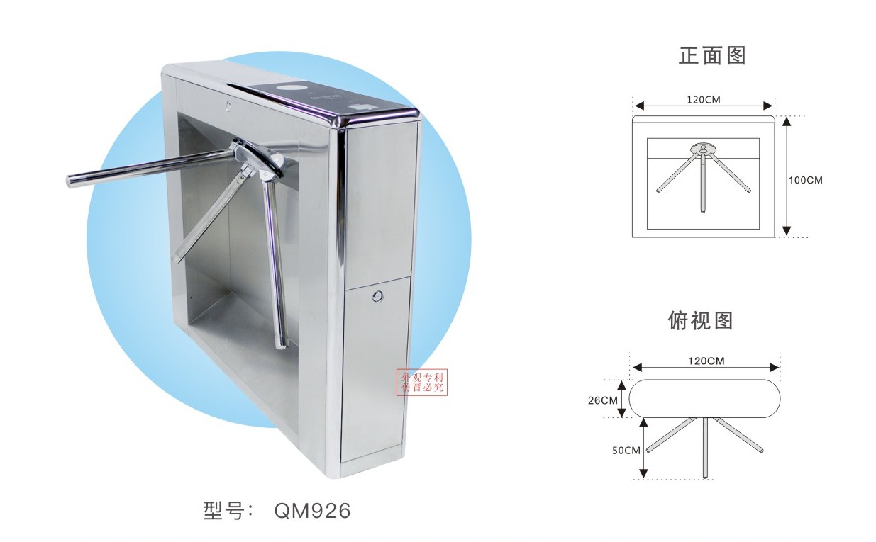 QM926型号三辊闸检票闸机可用于人行通道及自动检票管理,标配二维码识别、IC卡识别,可加配身份证、人脸识别模块,用于景区、陆地乐园、水上乐园、温泉酒店、科技馆、博物馆等。能够实现公共通道,劝阻级访问控制,在断电时闸机闸摆可自动打开,保证通道通畅,满足消防安全等需要。具备多种不同配置,可适用于不同场景,并可解决行人出入口通道所有的控制问题。
