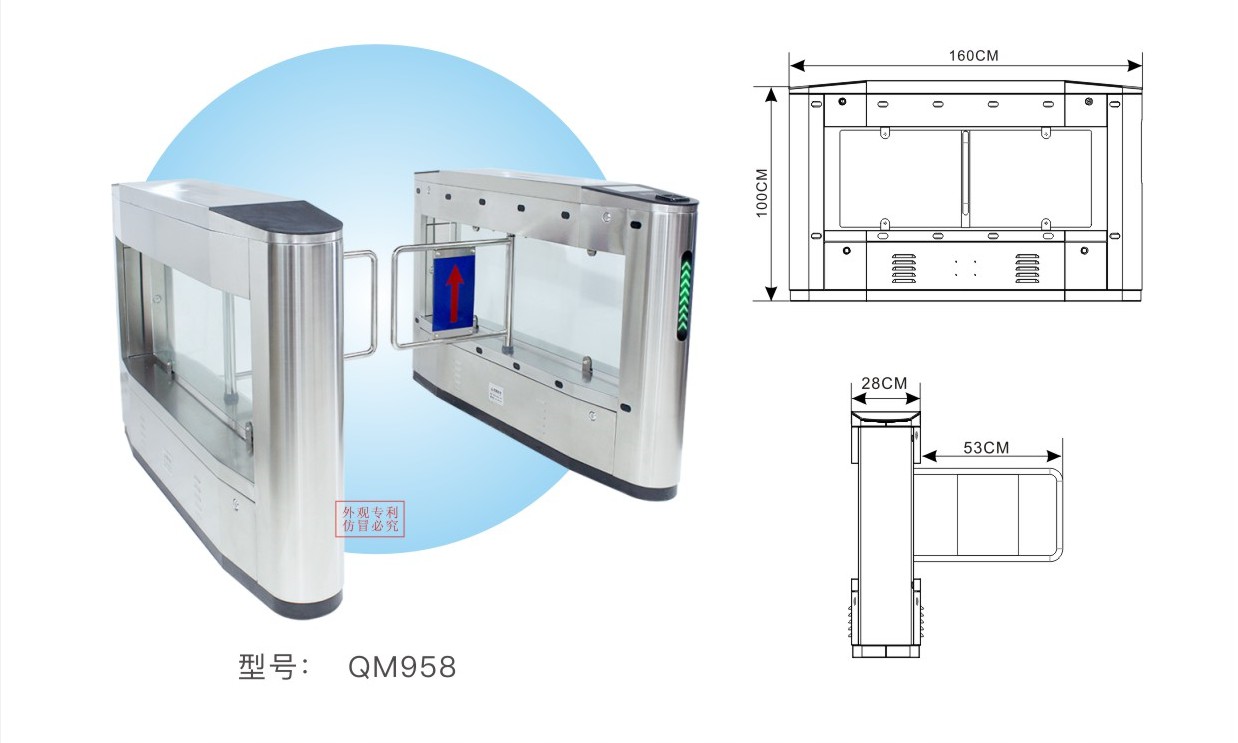 QM958智能检票摆闸是主要针对人员通道进行智能管理的高科技产品,该产cm品加工精细、功能齐全、档次高,主要用于高档小区、智能大厦、宾馆、地铁、码头会所等高档场所。 该设备将机械、电子、微处理器控制及各种身份识别技术有机地融为一体,方便兼容IC卡 、ID卡、条码卡、指纹等读卡识别设备的使用,通过选配各种身份识别系统设备和采用性能可靠的安全保护装置、报警装置、方向指示等,协调实现对通道智能化控制与管理等。