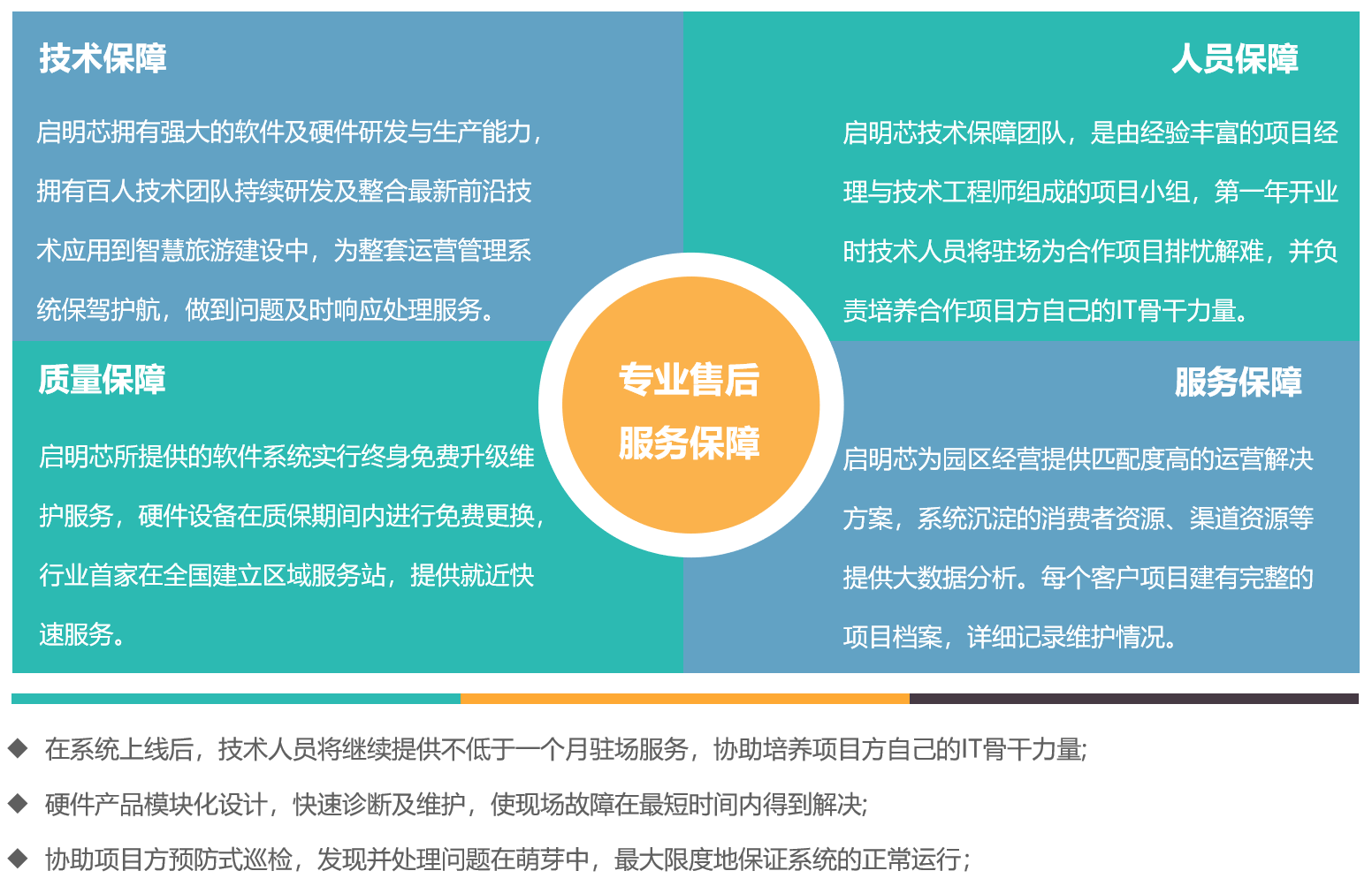 启明芯智能科技设有专业的客户售后服务部门,提供 7×24 小时售后服务,涵盖技术咨询、硬件设备返厂维修、项目工程人员技术指导,以及针对新增需求提供技术解决方案咨询等服务。